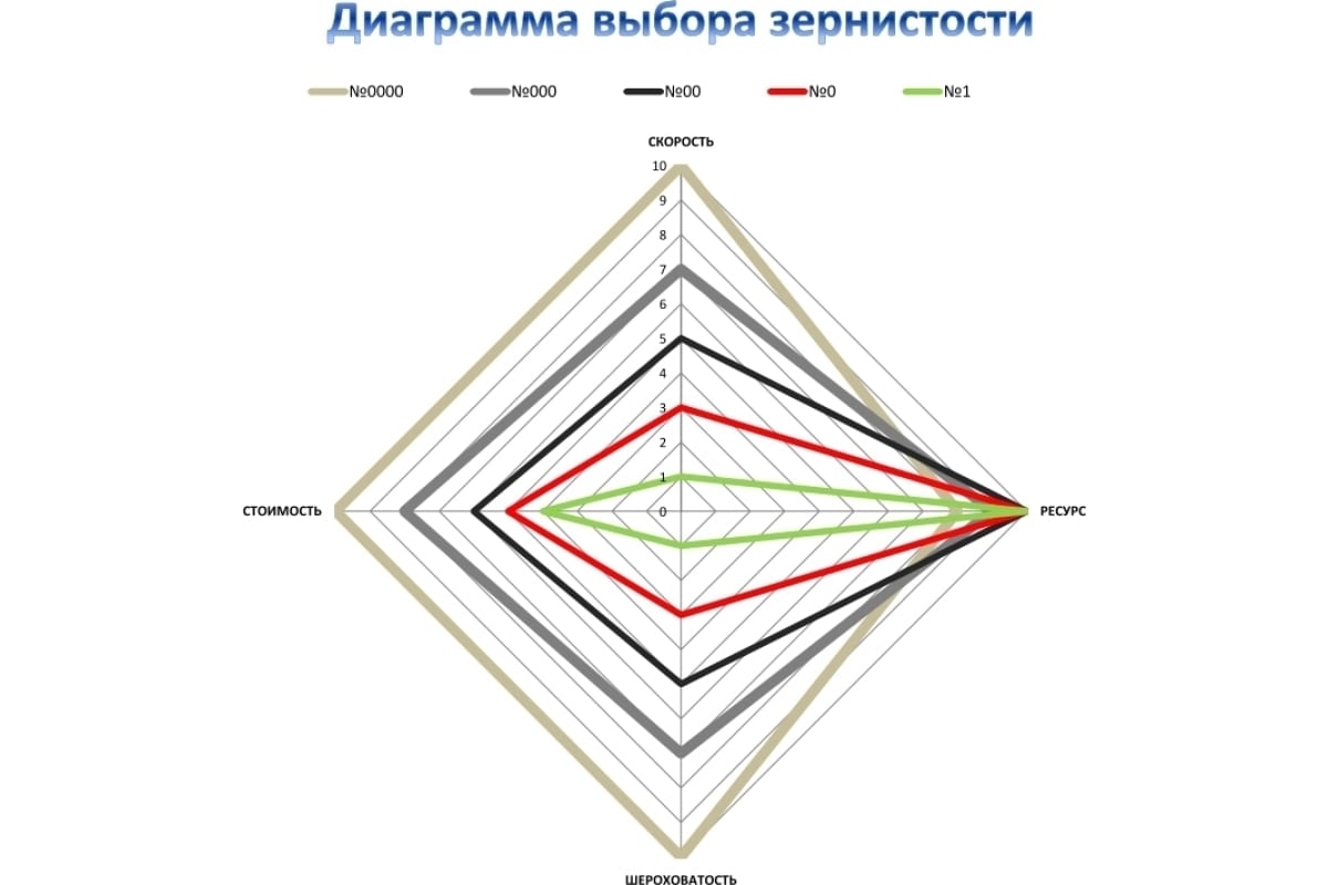 Общая рекомендация при выборе зернистости - чем крупнее алмаз, тем ВЫШЕ производительность и тем НИЖЕ ресурс. Зернистости по увеличению размера алмаза -1, 0, 00, 000, 0000.
