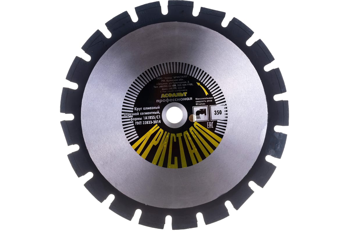 Круг алмазный сегментный 1A1RSS/C1 Кристалл 12351 предназначен для резки на бензорезах и нарезчиках швов асфальта, бетона, тротуарной плитки, свежего бетона. Профессиональная серия, ГОСТ 32833-2014.